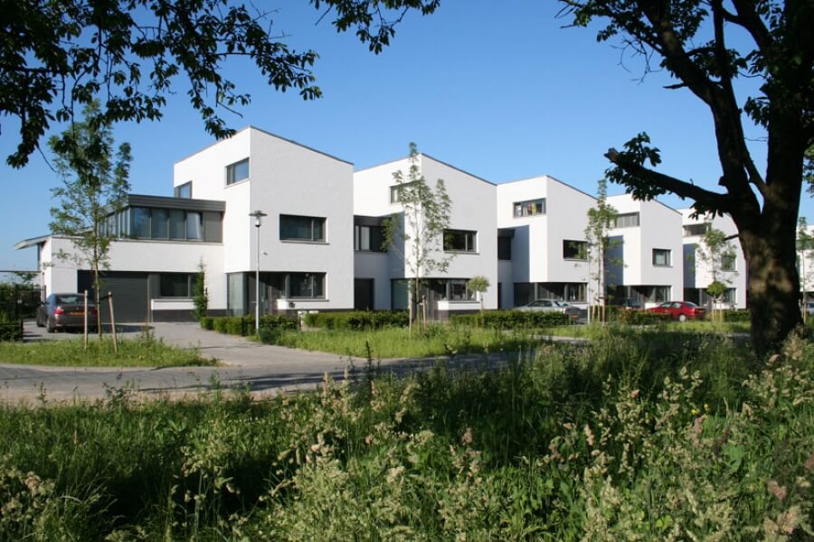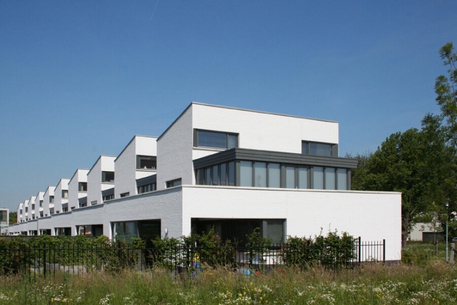 De 27 woningen zijn in drie rijtjes gesitueerd aan dwarsstraten die uitkijken op dit landschap. Het stedenbouwkundig plan heeft een tuindorpachtige kwaliteit met een moderne architectuurtypologie. De woningen zijn als afzonderlijke eenheden herkenbaar in de reeks en zijn zoveel mogelijk georiënteerd op het bijzondere uitzicht. De woningen zijn groot met een gebruiks­oppervlak van 206 m². Het gevelmetselwerk is wit gekeimd. Aan de achterkant voorkomt de uitbouw van de woonkamer directe inkijk in de tuin van de buren vanaf de verdiepingen.